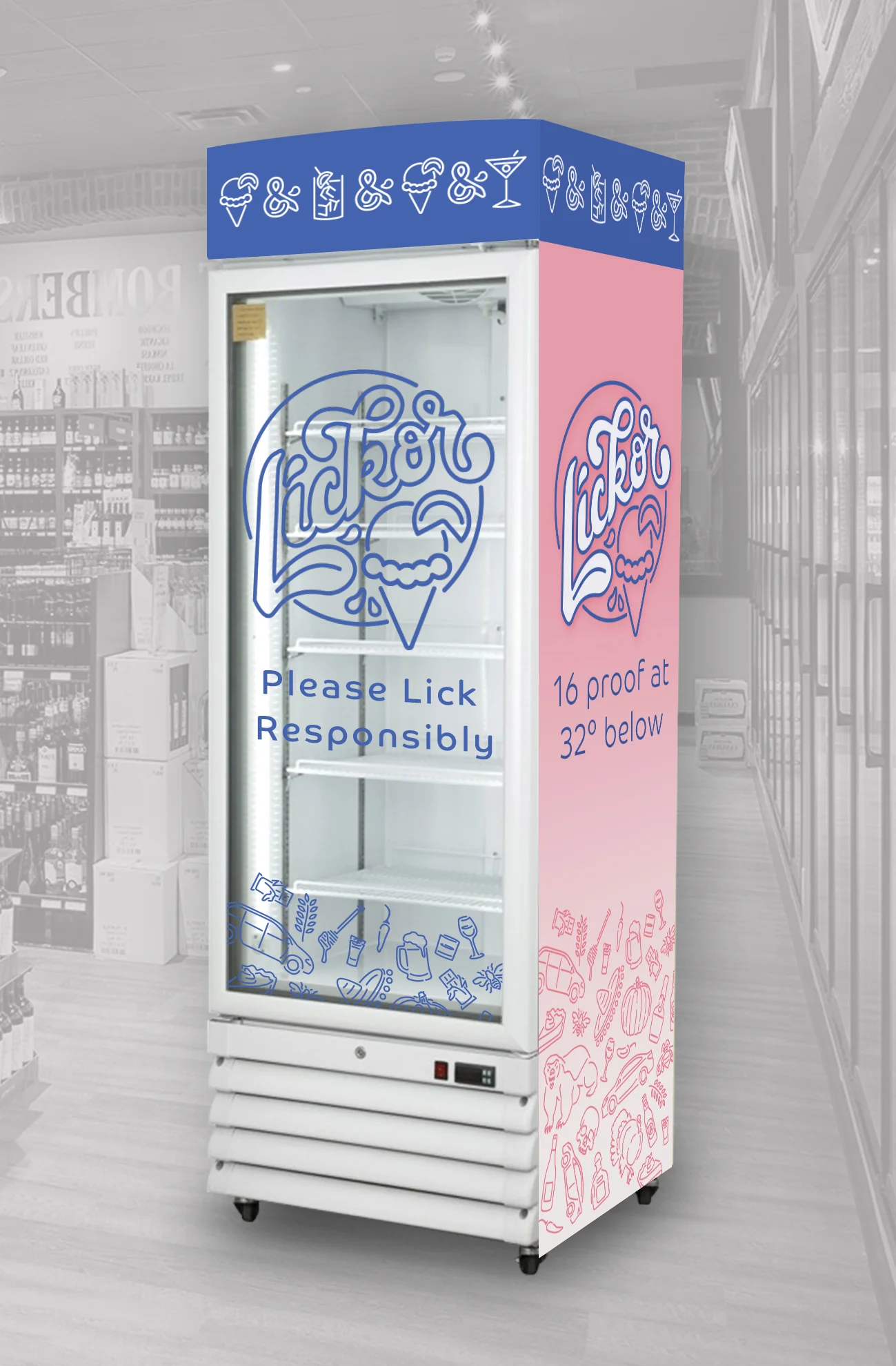 Featured on Packaging of the World, the pints of ice cream are made from recycled wine bottles with quark tops, which is both a nod to the alcoholic contents and a sustainable design. Below are process renderings of the packaging and a design exploration of a branded freezer for liquor stores.